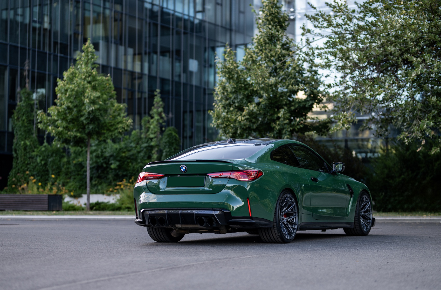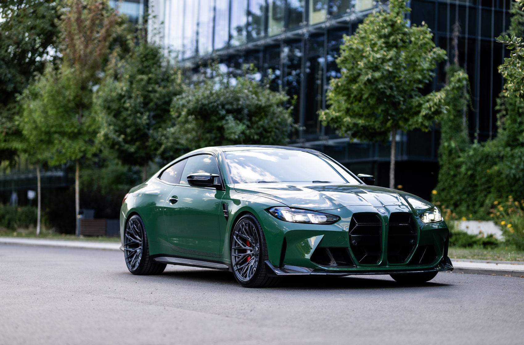The Satin Gunmetal finish gives the M4 a striking, stealthy character. The contrast between the deep metallic tone and the vivid green paint enhances the car’s muscular stance, perfectly framing its aggressive design language.